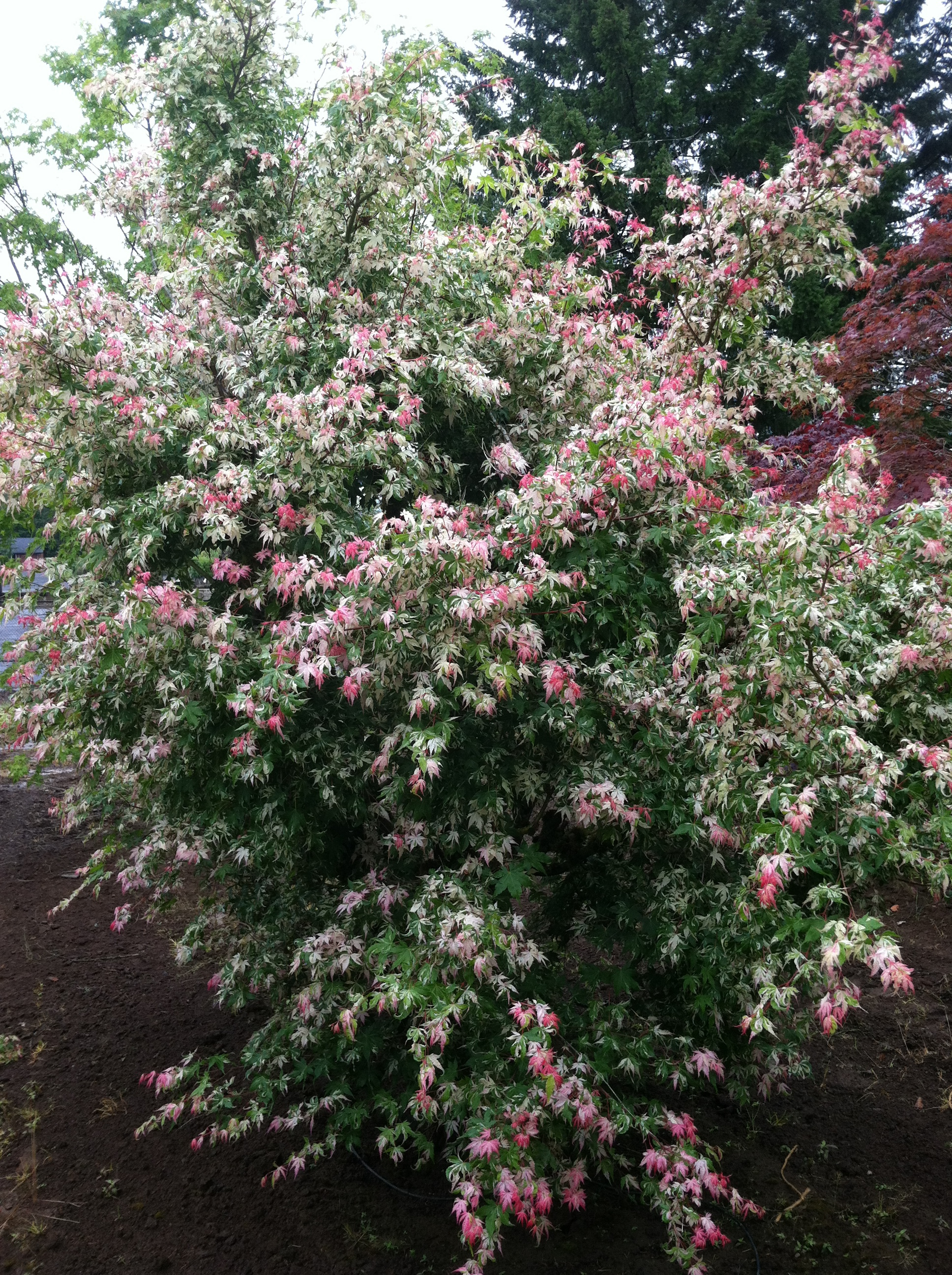 Love it or Hate it. The pink and white new growth and erratic variegation make Acer p. 'Asahi Zuru' an extremely unique garden addition. This specimen is a double transplant and leafs out very full. Approx. 10/12'H x 8/10'W.