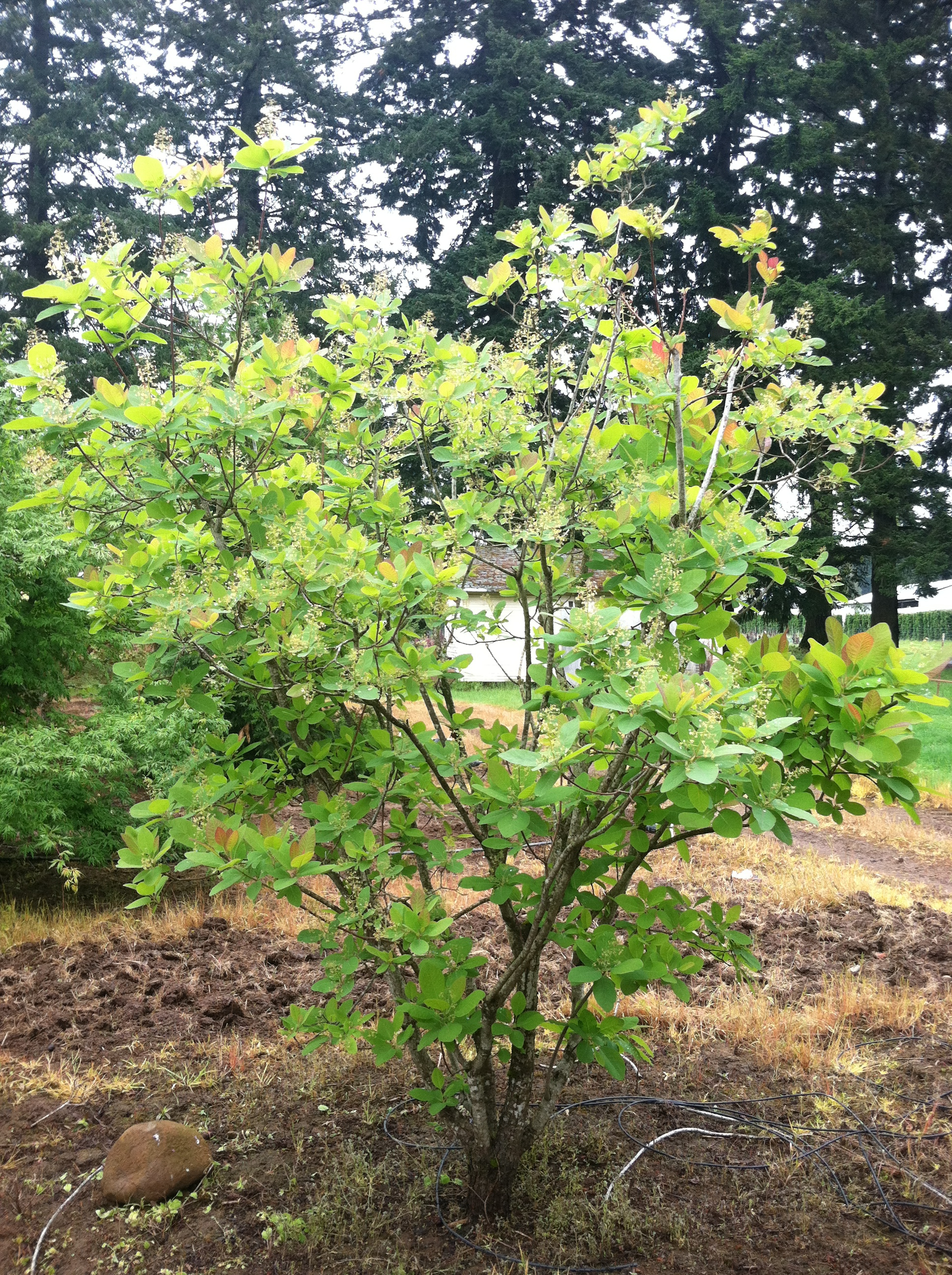 Cotinus obovatus is a rare find in the trade these days; especially one of any size. We have one gorgeous specimen that's pushing 7' tall & wide. Nice and full and just starting to push flowers. This is a one of a kind gem.